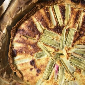 - Étaler la pâte feuilletée dans un plat à tarte et piquer le fond avec une fourchette. Disposer les morceaux de rhubarbe.*