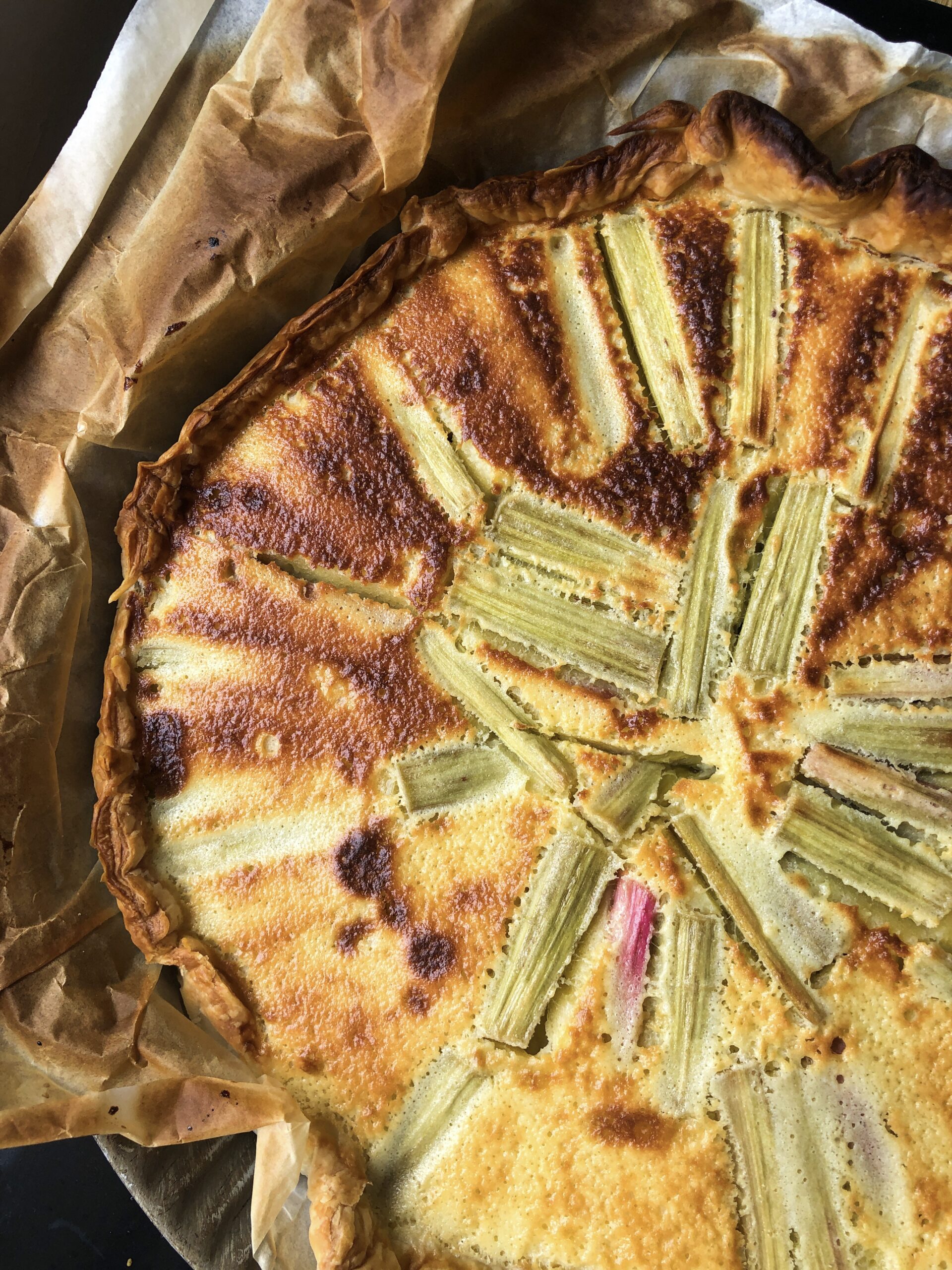 - Étaler la pâte feuilletée dans un plat à tarte et piquer le fond avec une fourchette. Disposer les morceaux de rhubarbe.*
