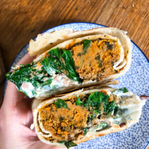 Les falafels se dégustent dans un délicieux wrap avec des légumes de saison, une sauce au yaourt avec le persil restant et des pickled onions. Rouler le wrap et le passer à la poêle avec du beurre.