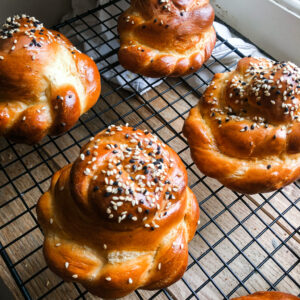 Rien de tel qu'une brioche juive pour accompagner un repas. Ces roses aux graines de sésame sont moelleuses et un tout petit peu sucrées. Ces brioches peuvent se substituer au pain ou être mangées tel quel.