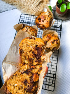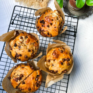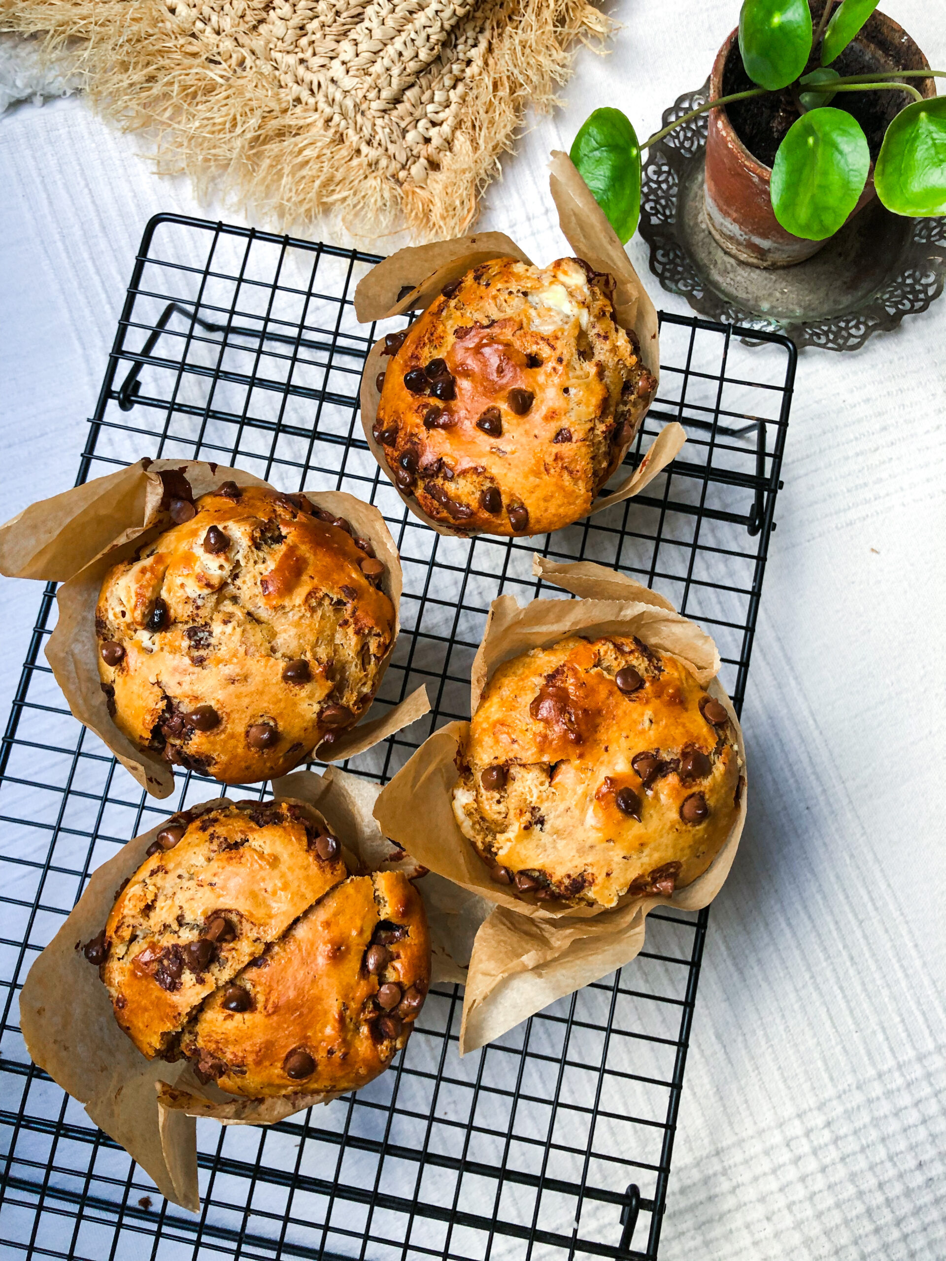 Avec mon moule à muffin jumbo de presque 8 cm de profondeur, je confectionne des muffins géants comme dans le commerce. Cette version végane est vraiment moelleuse. Vous pouvez remplacer les pépites de chocolat par des myrtilles ou autre baie si c'est la saison.