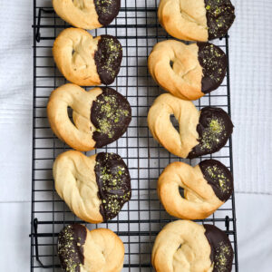 - Disposer les sablés sur une grille et saupoudrer de pistaches hachées finement lorsque le chocolat est encore mou. Laisser durcir le chocolat.
