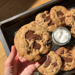 - Optionnel : à la sortie du four, taper quelques coups la plaque de cuisson sur le plan de travail pour aplatir les cookies.