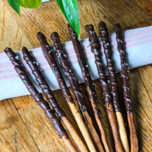 - Tremper chaque bâtonnet dans le chocolat et les disposer sur le tapis de cuisson pour que le chocolat durcisse.
