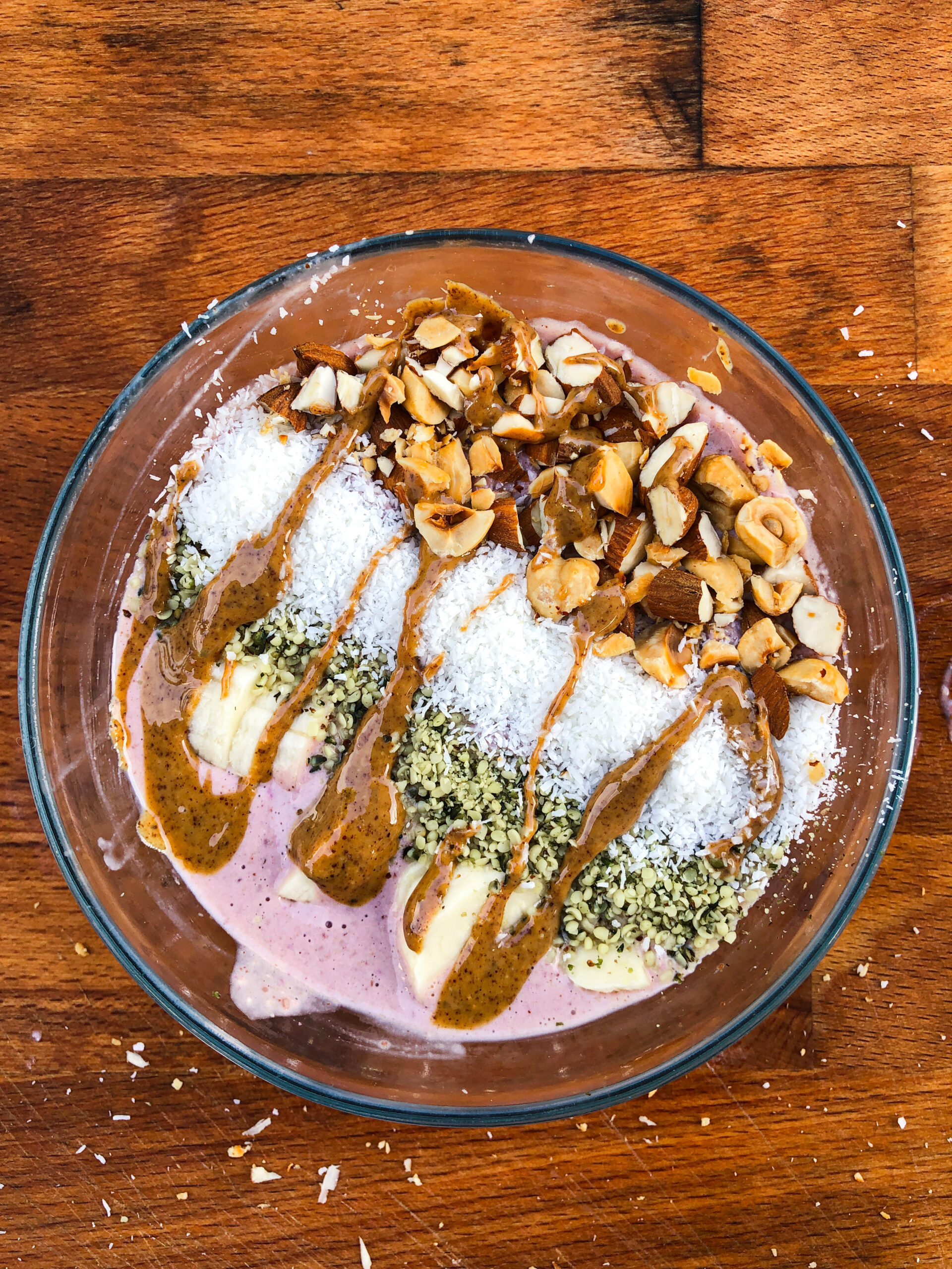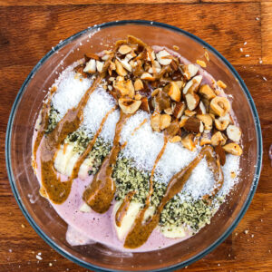 • Verser dans un bol et mettre les toppings par dessus.