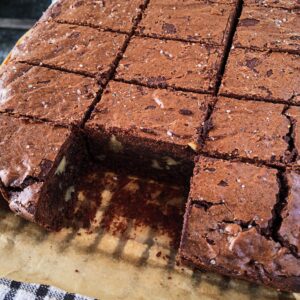 • Verser la préparation dans un moule carré à brownies de 20x20 cm chemisé ou beurré. Saupoudrer le dessus de fleur de sel en enfourner pour 25 à 30 minutes.