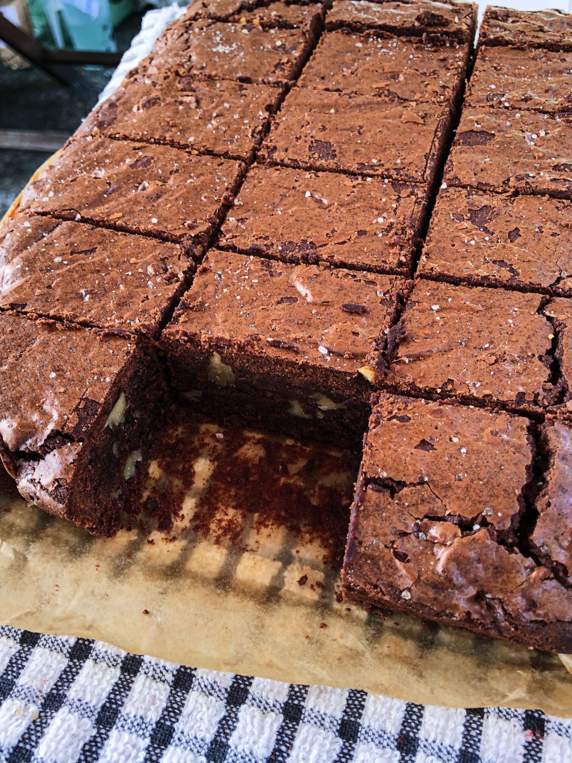 • Verser la préparation dans un moule carré à brownies de 20x20 cm chemisé ou beurré. Saupoudrer le dessus de fleur de sel en enfourner pour 25 à 30 minutes.