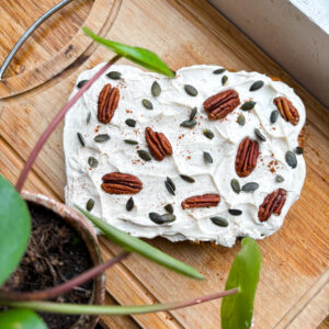 - Etaler le glaçage sur le gâteau froid et disposer quelques noix de pécan et graines de courge pour décorer.
