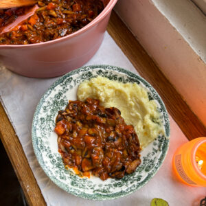 Un plat vraiment réconfortant pour l’hiver et végan. Ajouter du tofu ou des protéines végétales textures pour les protéines, je les ai ajoutées à côté au moment de manger. Les herbes et le vin rouge font vraiment illusion, c’est un vrai régal et de saison.