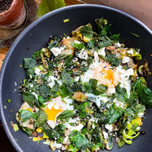 Une fois les légumes tendres, faire 2 empreintes dans la poêle. Y verser le reste d'huile d'olive et casser un oeuf dans chaque empreinte.