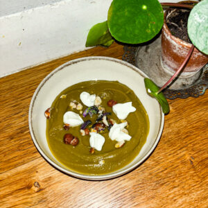 Pour servir, verser la soupe dans les bols, saupoudrer de cheddar, des noisettes concassées torréfiées, des feuilles de chou et verser 1 cuillère à soupe de yaourt grec.
